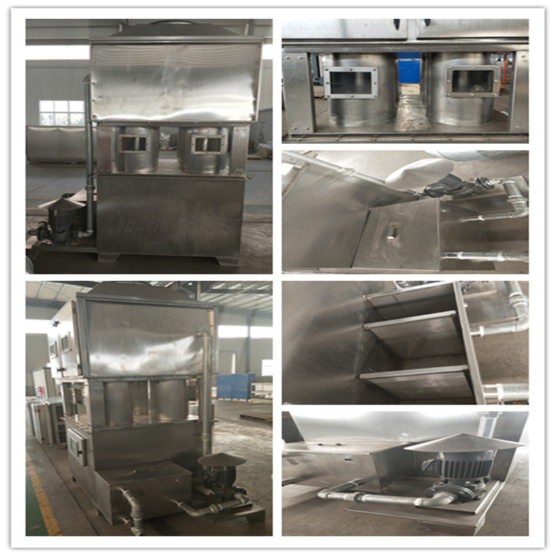 首先,收集的废气首先进入净化塔,气体由塔下部进气口进入塔内向上运动,喷嘴喷出的液滴向下运动,同时塔内装有填料,增大气液的接触面积,使气体与液滴充分接触,增强传质效率,达到降温和捕捉粉尘的目的。